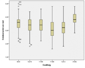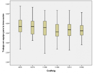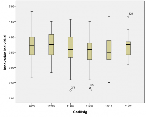 Los valores de los percentiles de las respuestas en cada asignatura se muestran en la tabla 3. Por ejemplo, vemos que un alumno de la asignatura “4633” que tenga como promedio 3,7 en la dimensión individual tendrá “por debajo” al 50% de sus compañeros que han contestado. Mientras que una persona de esa misma asignatura que tenga un promedio de 4,39 en la dimensión individual estará en el 10% con más puntuación en esa dimensión (es decir, tiene un 90% de sus compañeros con menos puntos que el/ella)